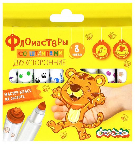 Выпускаются в картонной упаковке с европодвесом. Утолщённый корпус фломастера 15,5 мм. Диаметр пишущего наконечника треугольной формы 7,8 мм. В наборе 8 двусторонних фломастеров со штампами.