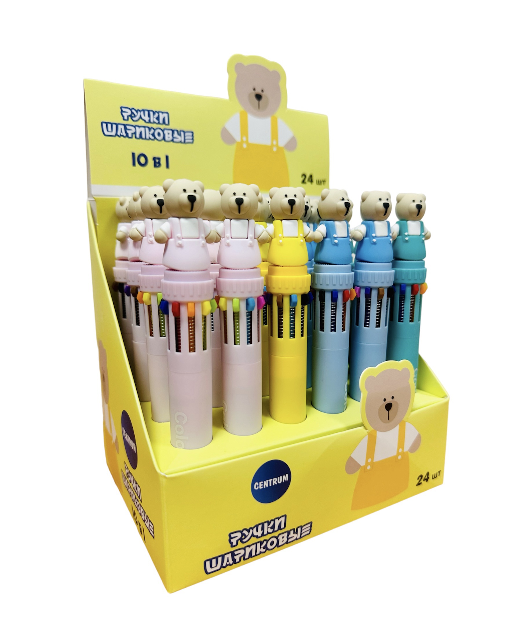 Ручка шариковая Centrum автоматическая "Мишка". Модель удобна в использовании, экономит место в пенале или на рабочем столе, позволяет всегда иметь под рукой набор основных цветов для письма и выделения записей. Пластиковый круглый корпус дополнен резиновой фигуркой, не утяжеляющей ручку. Ручка содержит 10 цветов (черный, коричневый, синий, красный, оранжевый, желтый, зеленый, голубой, розовый, фиолетовый) с оптимальной толщиной пишущего узла 0,7 мм. Автоматический нажимной механизм, обеспечивает плавную подачу необходимого стержня. Разноцветные чернила оптимальной консистенции равномерно распределяются при письме, мгновенно высыхая и не размазываясь. Металлический наконечник не деформирует бумагу, обеспечивает плавное и мягкое скольжение, оставляя ровные и четкие линии. Упаковка - фирменный картонный стенд.