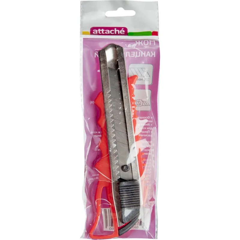 Канцелярский нож Attache с сегментированным отламывающимся лезвием оптимален для резки бумаги, распечатывания корреспонденции и посылок. Он оснащён эргономичной ребристой рукояткой, что улучшает противоскользящие свойства и делает работу с ножом более удобной. Металлическая направляющая из нержавеющей стали гарантирует надёжную фиксацию лезвия в процессе использования. Также на рукоятке есть отверстие для подвешивания ножа, что удобно при хранении.
